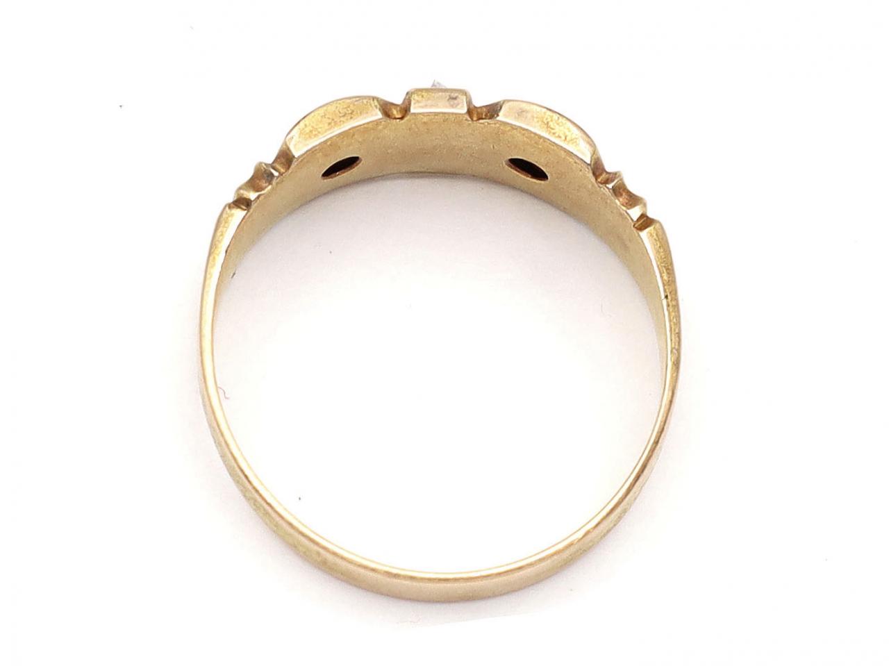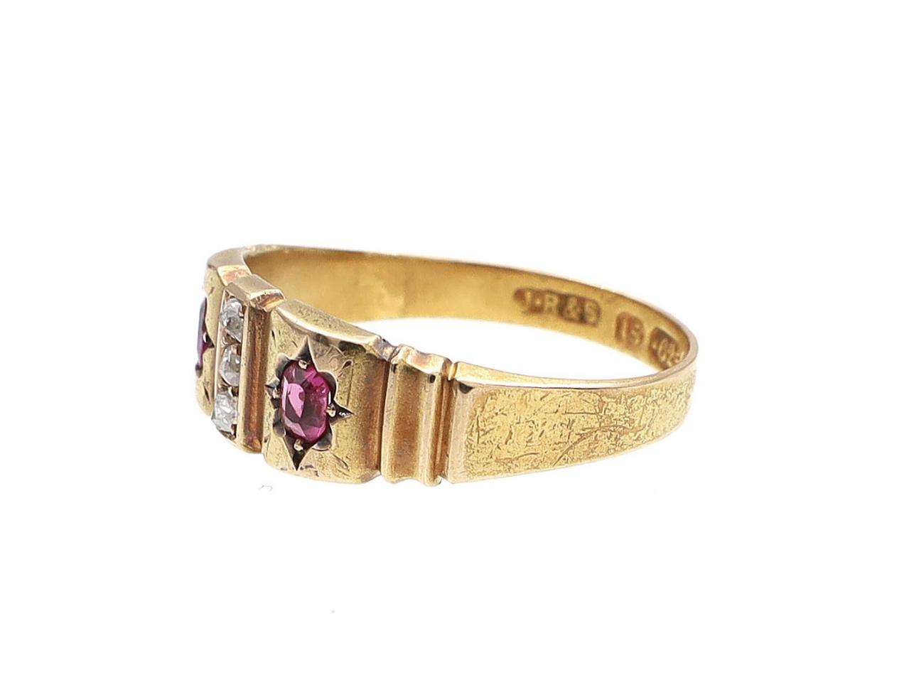 1889 diamond and ruby gypsy ring in 15kt yellow gold. Centred with a vertical row of round rose cut diamonds in grain settings, flanked on either side with two cushion shape mixed cut rubies in gypsy star settings, to a incised gypsy ring with intergrated trumpeting shoulders with ribbed details terminating to a solid shank. Hallmarked 15kt gold, Birmingham, 1889.