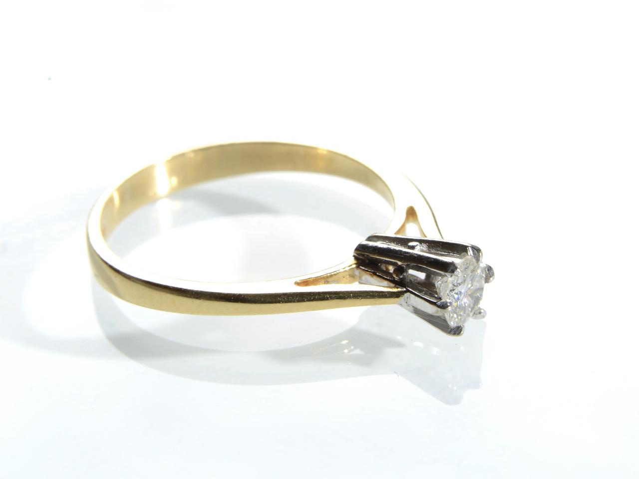 18kt yellow gold 0.25ct diamond solitaire ring, set with a round brillisnt cut diamond in a raised six claw platinum setting, flanked by raised inwardly tapering shoulders which curve to a solid shank. Marked 18ct gold.