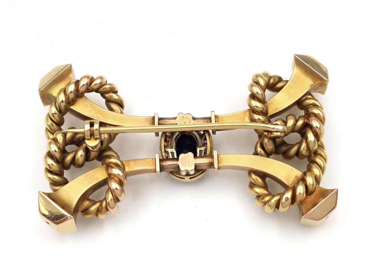 18kt yellow gold, sapphire and diamond retro rope brooch.