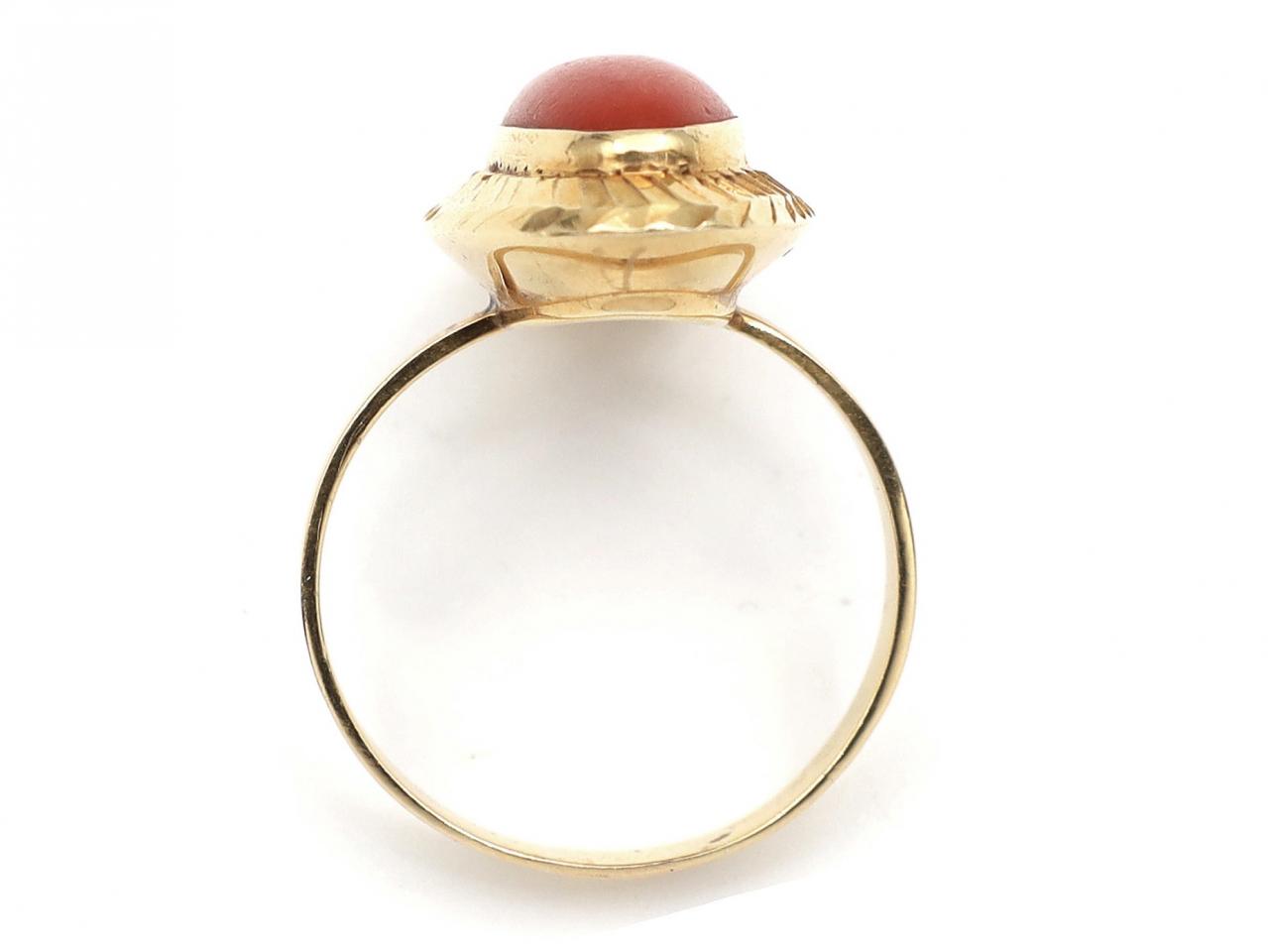 1970s oval coral dress ring in 18kt yellow gold. Set with an elongated oval cabochon in a millegrain setting framed by a repeating chevron faceted border with a recessed polished gallery flanked by polished square shoulders which smooth to a solid shank. Marked 18kt gold.