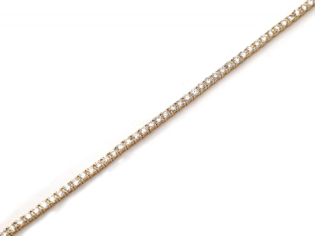 3.00ct diamond line bracelet in 18kt yellow gold. Set with round brilliant cut diamonds in four claw settings and fitted with a secure integrated push clasp mechanism and double hinged safety latch. Estimated total diamond weight 3.00cts. Hallmarked 18kt gold.