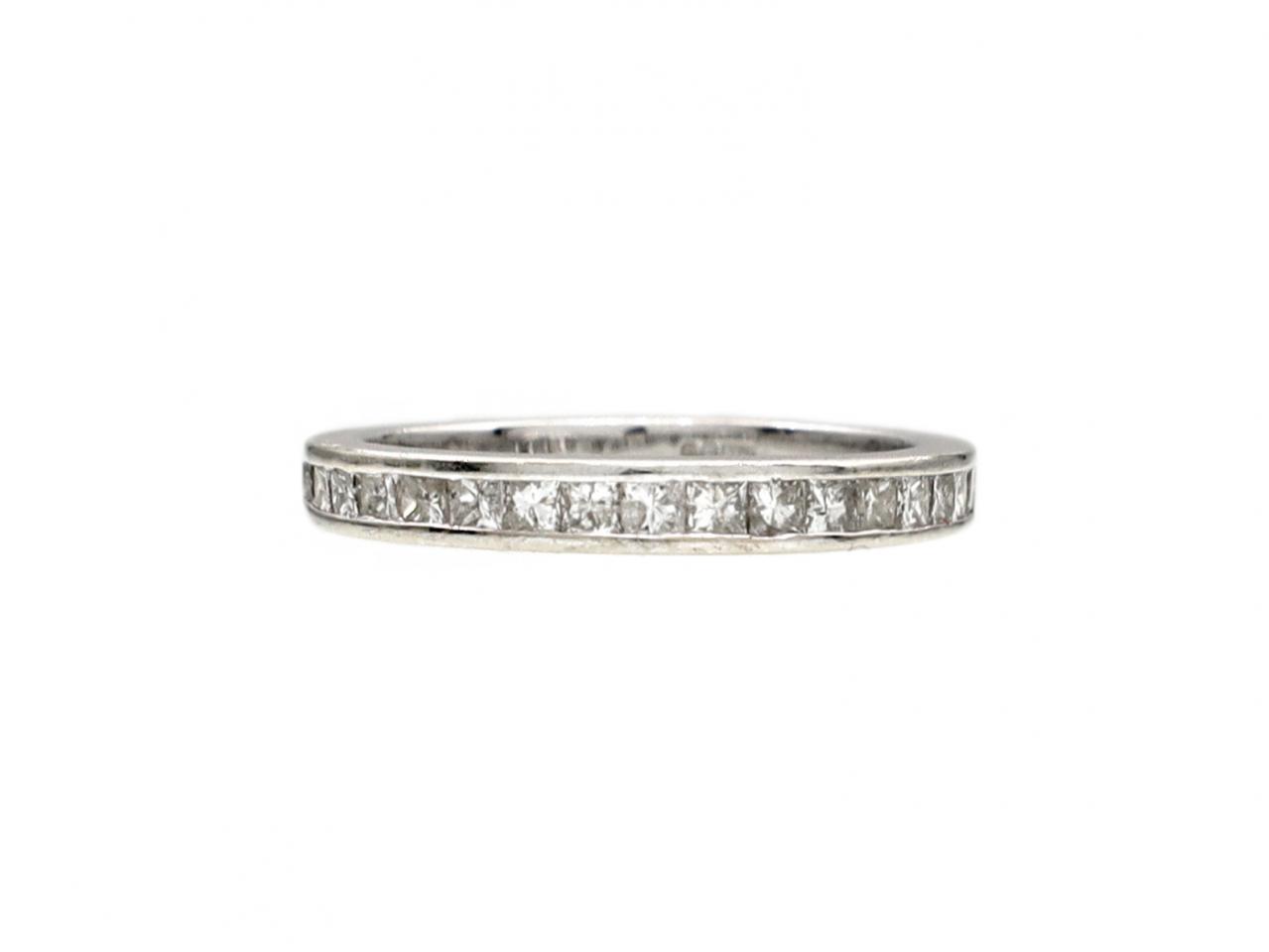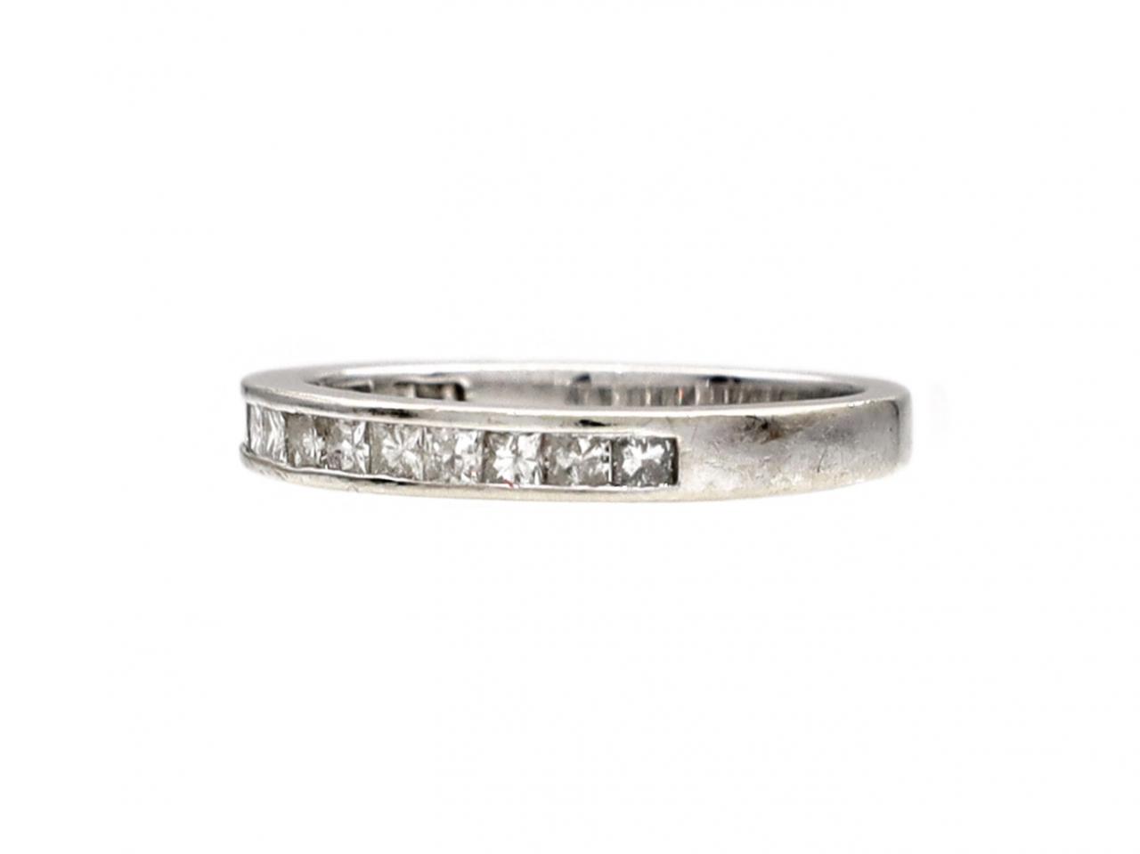 9kt white gold channel set princess cut diamond half eternity ring. Set with square brilliant cut diamonds in channel settings, to a half eternity with polished parallel borders and smooth integrated shank. Hallmarked 9kt gold.