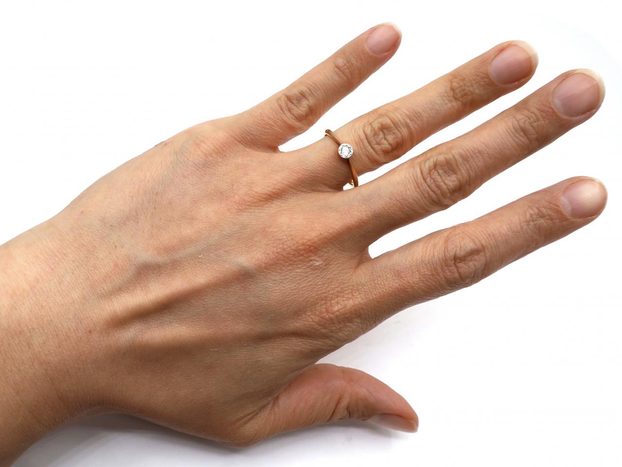Antique 0.15ct diamond solitaire ring in platinum and 18kt yellow gold. Set with a 0.15ct round old cut diamond in a platinum faceted illusion setting, to a raised circular collet with pierced linear decoration and flanked by raised inwardly tapering shoulders which curve to a solid shank. Marked platinum and 18kt gold.
