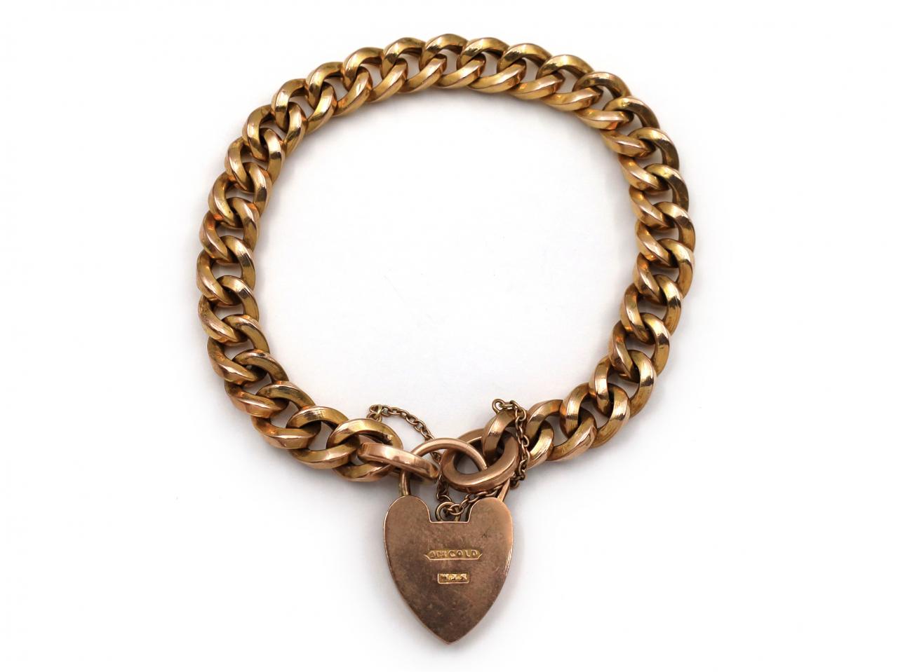 Antique 9kt yellow gold close curb bracelet with heart lock. Hallmarked 9kt gold.