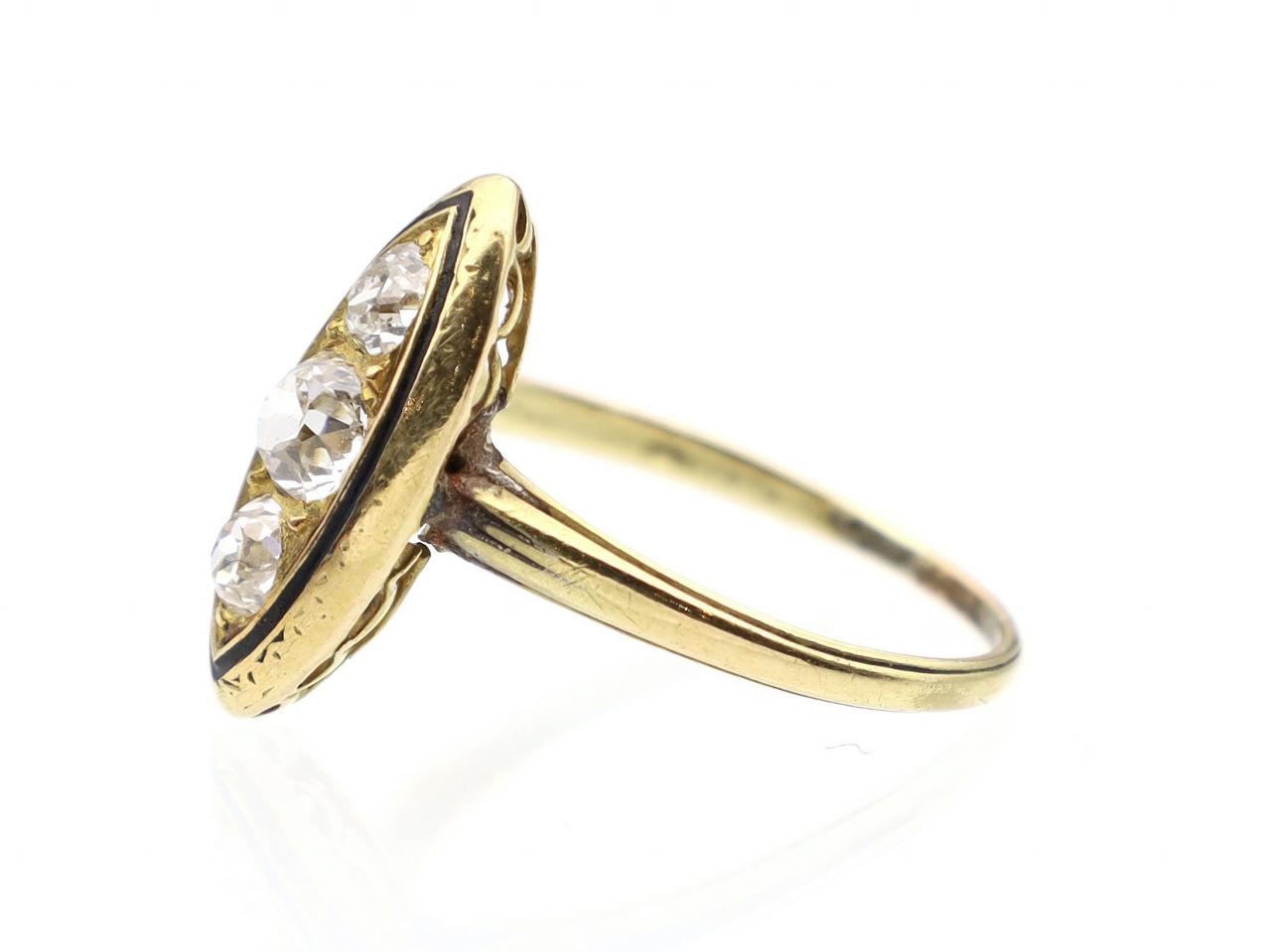 Antique black enamel and Old Mine cut diamond three stone navette ring in 18kt yellow gold. Vertically set with three cushion shape Old Mine cut diamonds in grain settings, to a graduating three stone design, framed by a border of fine black enamel and further bordered by a incised edge, decorated with a pierced scalloped gallery and flanked by trumpeting shoulders which curves to a slim shank.