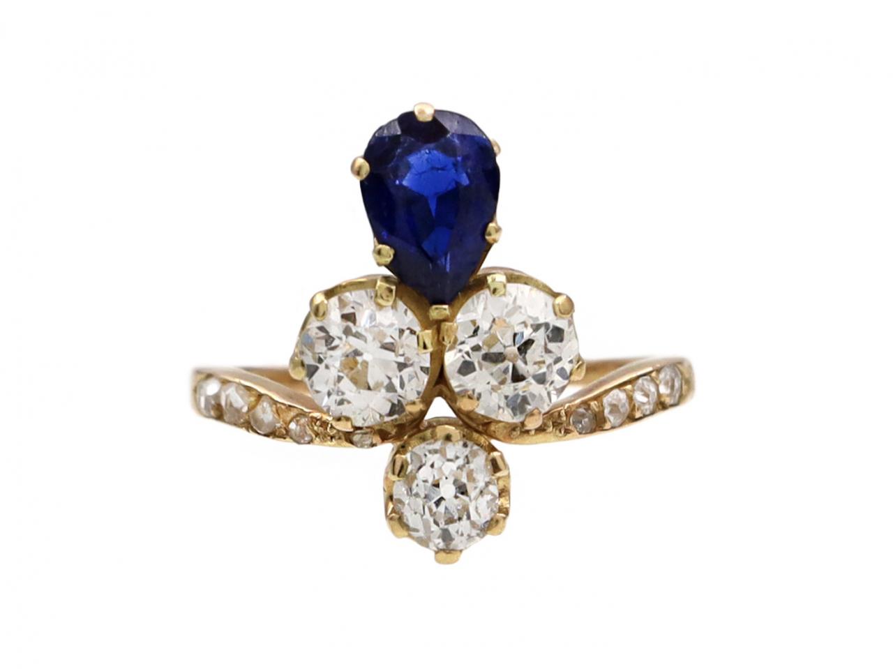 Antique diamond and sapphire duchess cluster ring in 18kt yellow gold. Centred with two round Old European cut diamonds in claw settings, set to top with a pear shape mixed cut sapphire in a claw setting and set to bottom with a round Old European cut diamond in a claw setting, to a duchess cluster design with curving claws and intricately pierced gallery, flanked to either side with diamond set inwardly tapering shoulders which flow up and terminate to a solid shank.