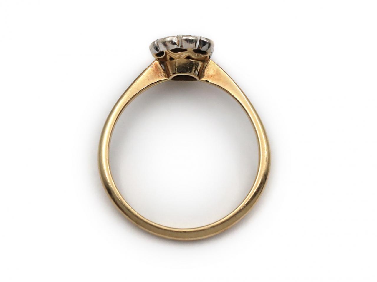 Antique diamond daisy cluster ring in platinum and 18kt yellow gold. Set with eight round eight cut diamonds in grain platinum settings, to a petite floral cluster design with scalloped borders and pierced gallery, met to either side with inwardly tapering shoulders which smooth to a slim shank. Marked 18kt gold.