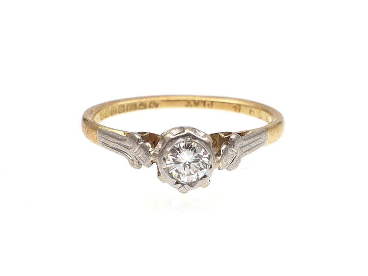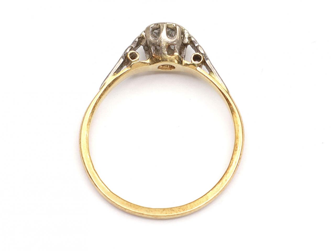 Antique diamond solitaire ring with fleur de lis shoulders in platinum and 18kt yellow gold. Centrally set with a 0.25ct round Old European cut diamond in a platinum illusion setting, to an elegant solitaire design with a raised circular collet with pierced linear gallery and flanked to either side with raised platinum shoulders in the form of fleur de lis motifs and supported by cheniers, ternminating to a slim shank. Hallmarked 18kt gold, London.