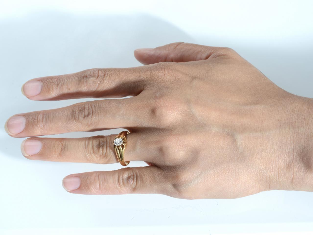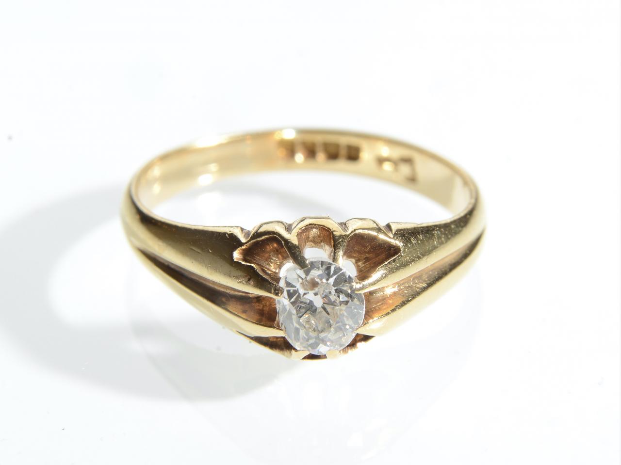 Antique diamond solitaire signet ring in 18kt yellow gold, centred with a 0.40ct cushion shape Old Mine cut diamond in a bespoke claw setting, to a integrated gypsy set solitaire with curving claws, ribbed gallery and incised shoulders which taper to a solid shank. Marked 18kt gold, London, 1920.