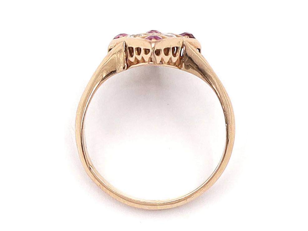 Antique lozenge shape crisscross ruby and diamond cluster ring in 18kt rose gold. An angular cluster set with alternating rows of cushion shape mixed cut rubies in grain settings and round old cut diamonds in grain settings, decorated with raised diagonal borders and sweeping scalloped gallery, the open trumpeting shoulders join to a solid shank. Hallmarked 18kt gold, French.