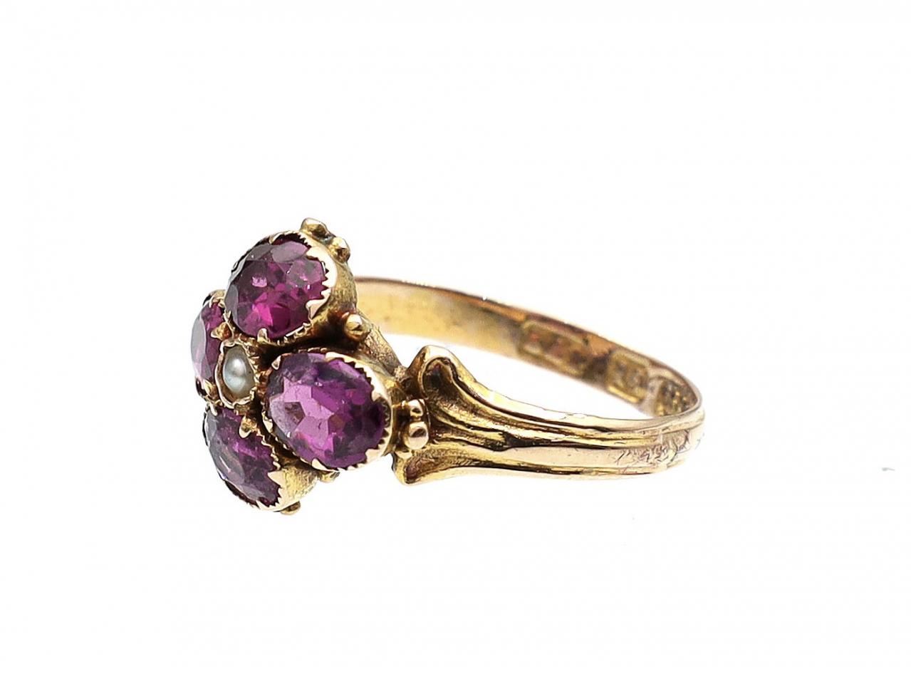 Antique quatrefoil garnet cluster ring in yellow gold. Centred with a subtle seed pearl surrounded by four oval mixed cut almandine garnets in claw and millegrain settings, to a sweet cluster design with granule decoration and flanked to either side with carved trumpeting shoulders which continue to a solid shank.