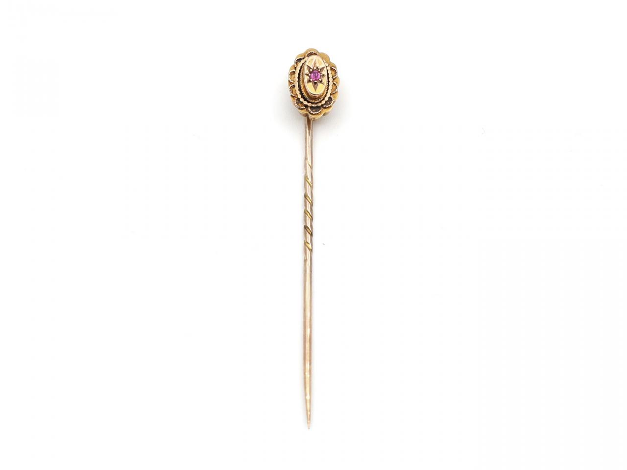 Antique ruby tie pin in yellow gold. An oval tablet in relief centred with a round ruby in a gypsy setting, framed by an elabrate gold border, fitted to the reverse with a secure pin.