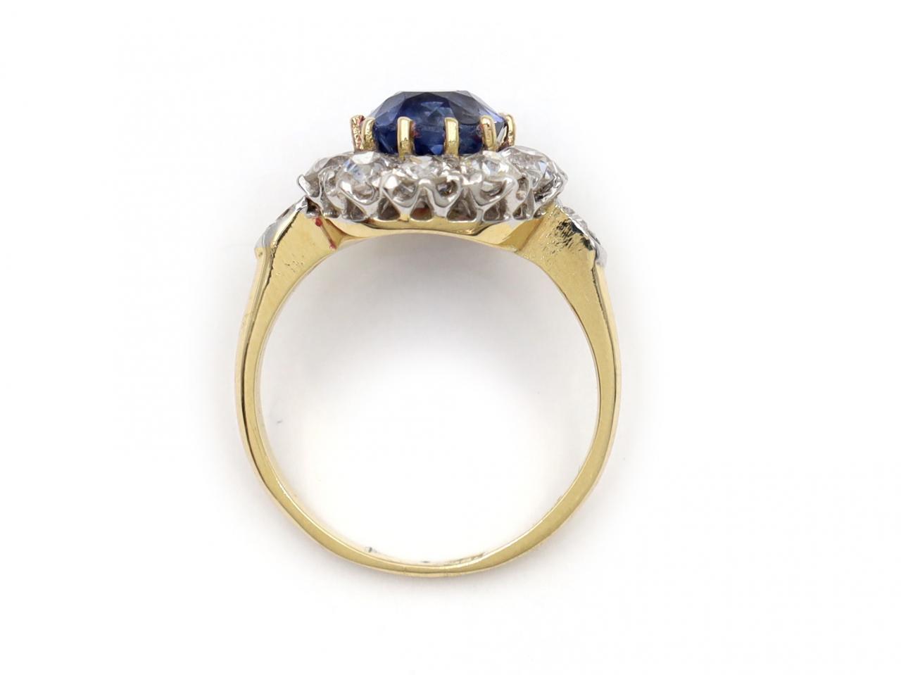 Antique sapphire and diamond coronet cluster engagement ring in 18kt yellow gold. Centrally set with a 2.85ct oval mixed cut sapphire with no indications of heat treatment in a raised claw setting, encircled by a single row of round Old European cut diamonds in platinum claw settings, to an elegant oval cluster design with curving claws, intricately pierced gallery and flanked to either side with diamond set shoulders which terminate to a solid shank. Estimated total diamond weight 1.50cts. Marked 18kt gold.
