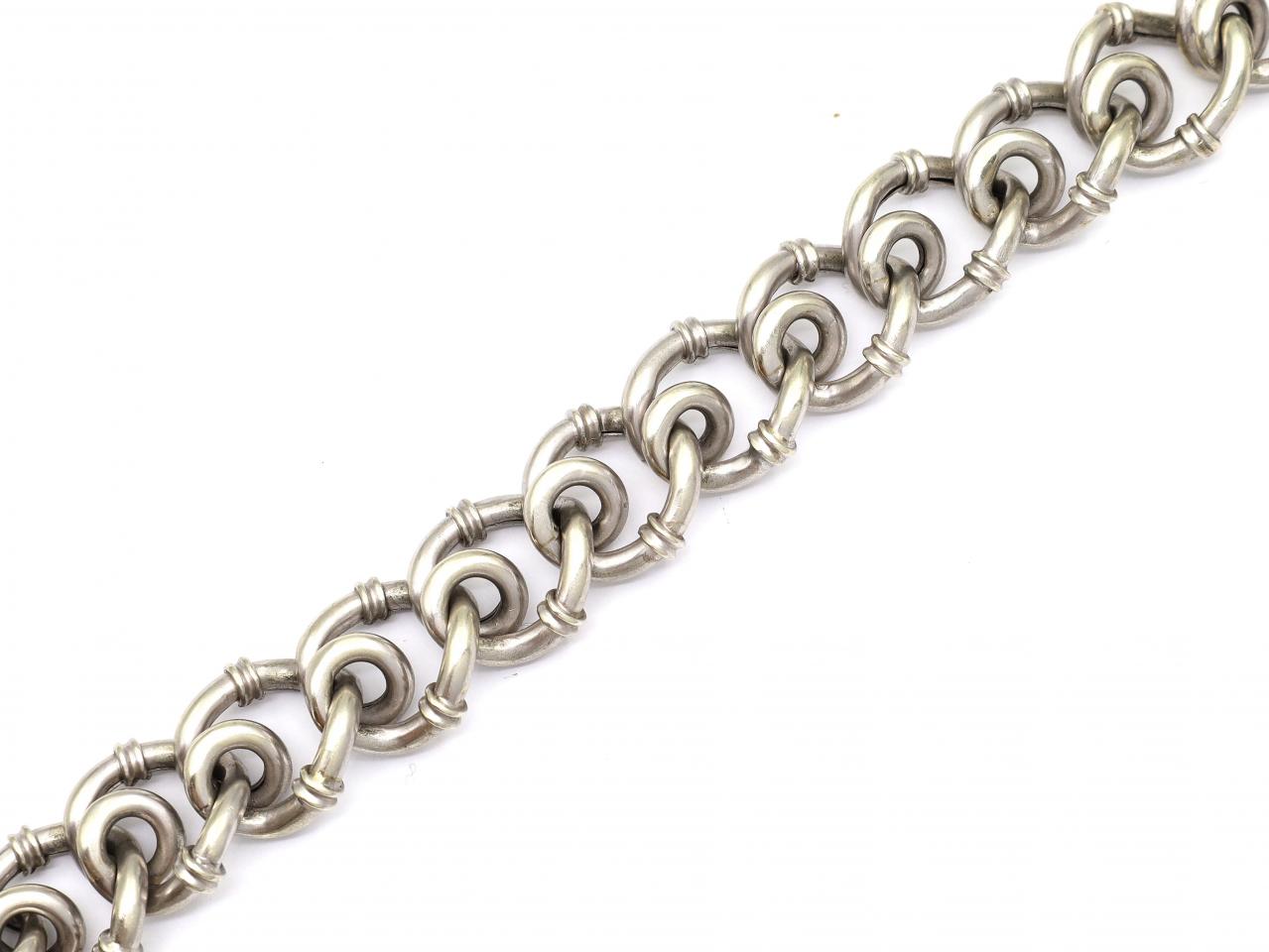 Vintage 9kt white gold fancy ribbed bracelet. A curling hollow link with a repeating pattern of double ribbed terminals, fitted with a push clasp mechanism and safety latch.