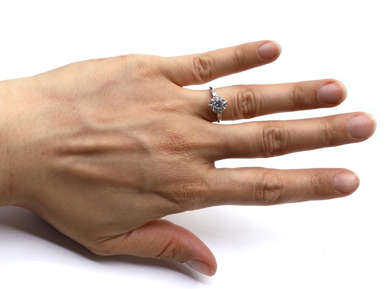 Art Deco 2.03ct round Old European cut diamond solitaire ring in platinum. Centred with a 2.03ct round Old European cut diamond, G colour, VS2 clarity, in a four claw North, South, East, West setting, flanked by horizontally set rectangular baguette cut diamonds in rubover settings, terminating to raised chevron edges that smooth to a slim shank. Accompanied by a Gemological Institute of America certificate.