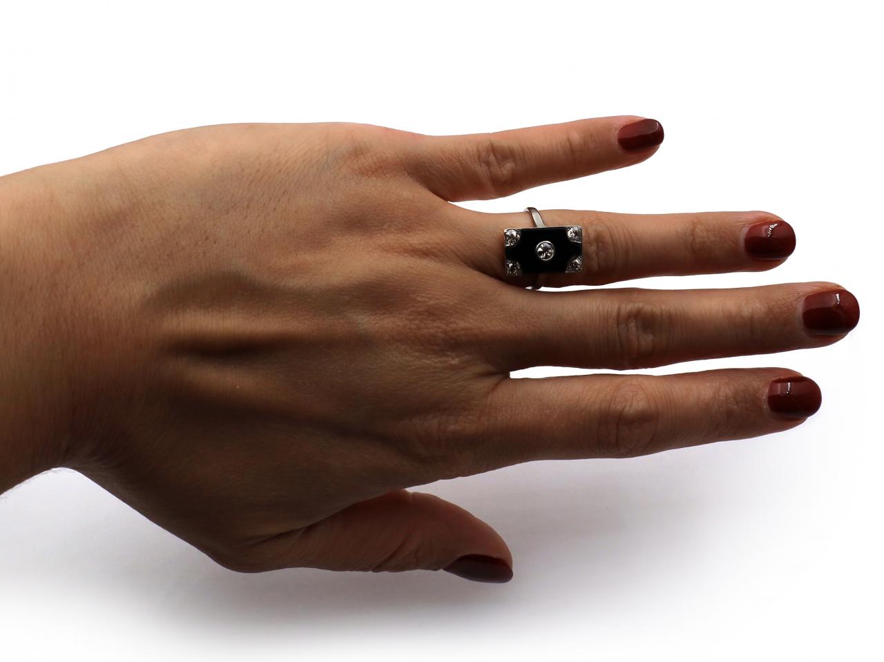 Art Deco diamond and onyx plaque ring in platinum. A rectangular plaque centred with a round old cut diamond in a millegrain setting, further set to each corner with four round old cut diamonds in grain settings, further fitted with a fitted tablet of onyx, to a stylish plaque ring with open linear gallery and raised shoulders which curve to a slim shank.