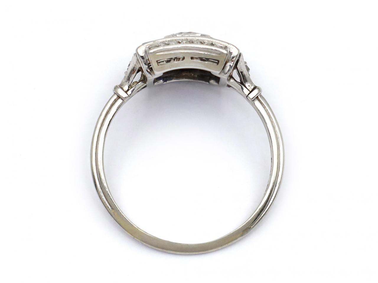 Art Deco diamond and sapphire square target ring in platinum. Centrally set with a round Old European cut diamond in an octagonal collet setting, surrounded by a square cluster of rectangular callibre cut sapphires in invisible settings, further enhanced to top and bottom with a panel of round eight cut diamonds in grain settings, to a geometric target design with millegrain decoration, linear gallery and diamond set shoulders which terminate to a ribbed shank.
