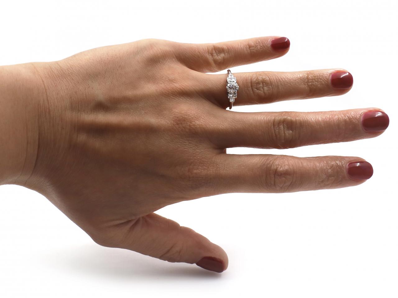 Art Deco diamond flanked solitaire engagement ring in platinum. Set with an estimated 0.50ct round Old European cut diamond in a claw setting, flanked to either side with six square step cut diamonds in channel and rubover settings, to a stylish solitaire design with curving claws, step shoulders and intricate openwork gallery, the raised shoulders continue to a solid shank.