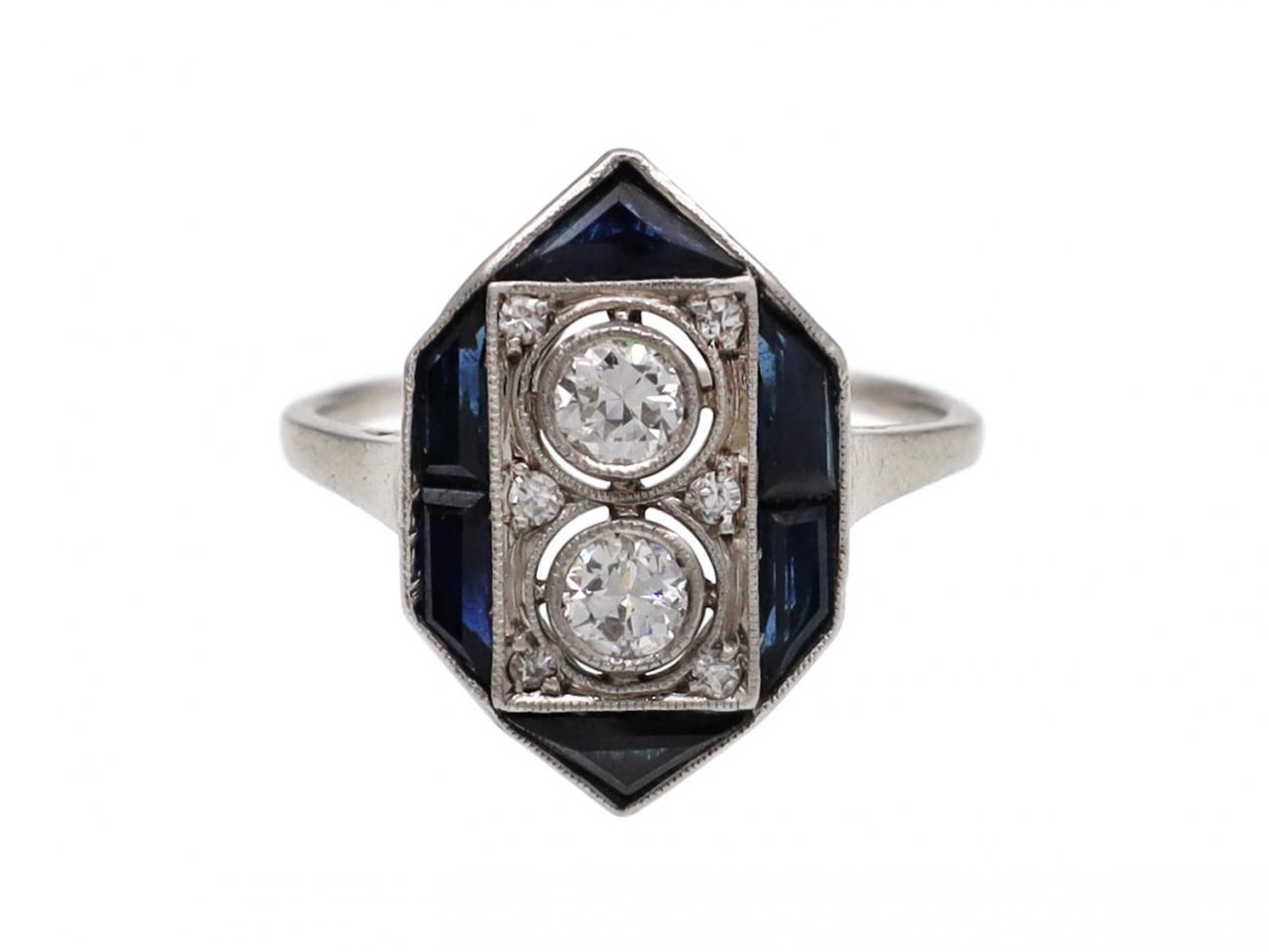 Art Deco hexagonal diamond and sapphire cluster ring in platinum.