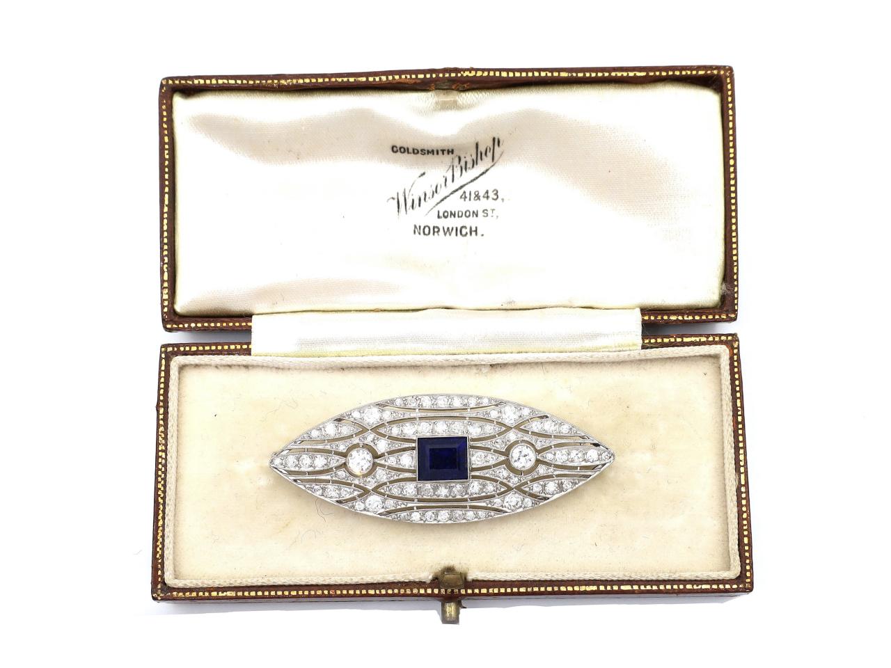 Art Deco square sapphire and diamond navette brooch in platinum.