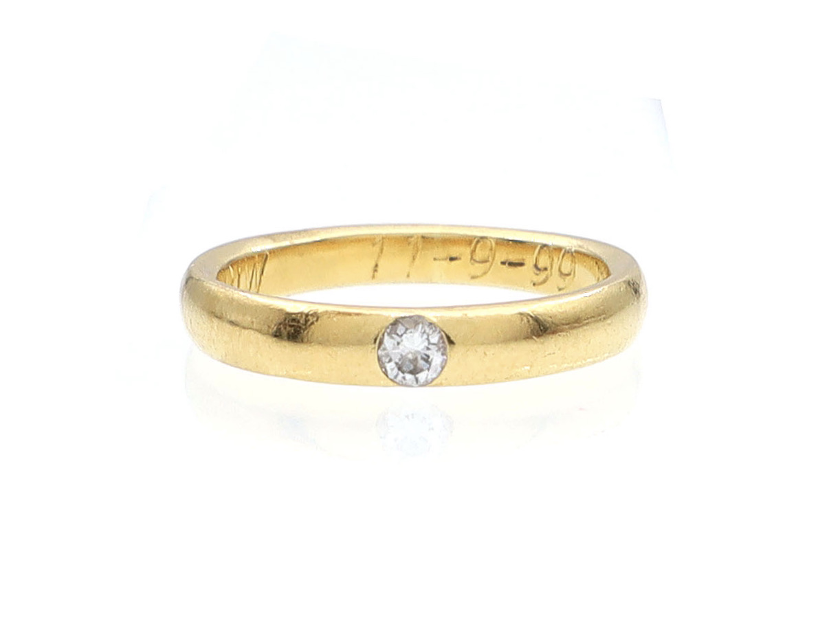 Contemporary diamond set 20kt yellow gold ring. A 3.5mm polished band centred with a round brilliant cut diamond in a rubover setting. Marked 20kt gold.