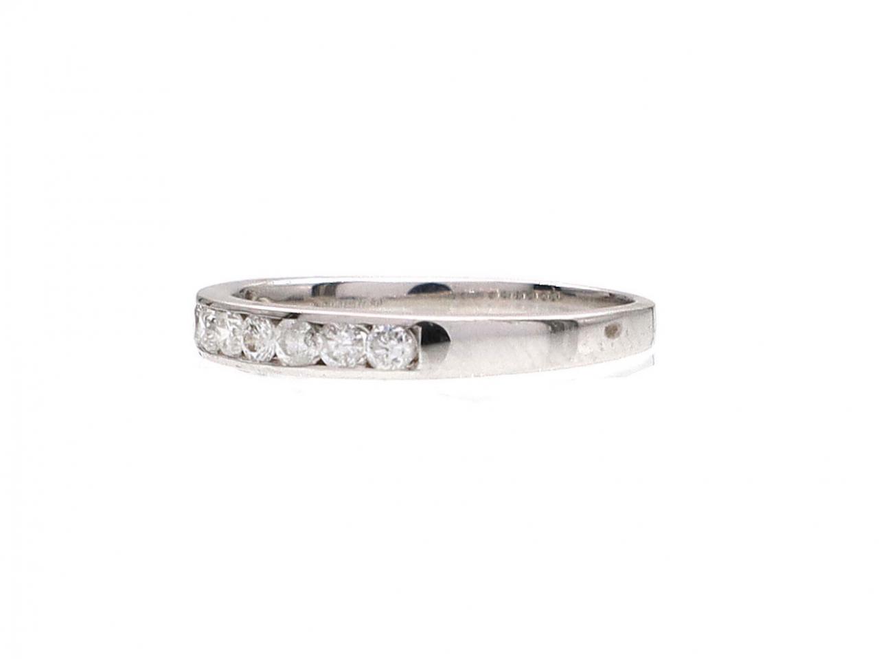 Diamond channel set half eternity ring in 18kt white gold. Set with ten round brilliant cut diamonds in channel settings, set to either side with integrated shoulders which curve to a solid shank. Hallmarked 18kt gold.