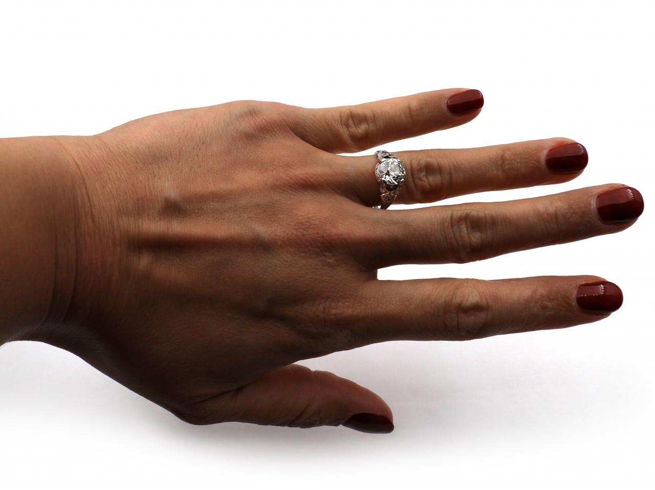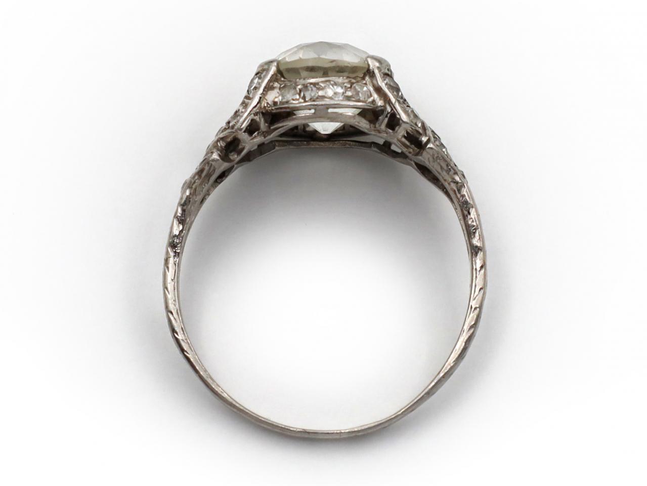 Edwardian 1.96ct Old European cut diamond solitaire ring. Set to the centre with a 1.96ct round Old European cut diamond in a stylised four claw setting, surrounded by grain set diamonds with millegrain highlights, further decorated to the shoulders with twisting diamond set shoulders which terminate to a slim engraved shank.