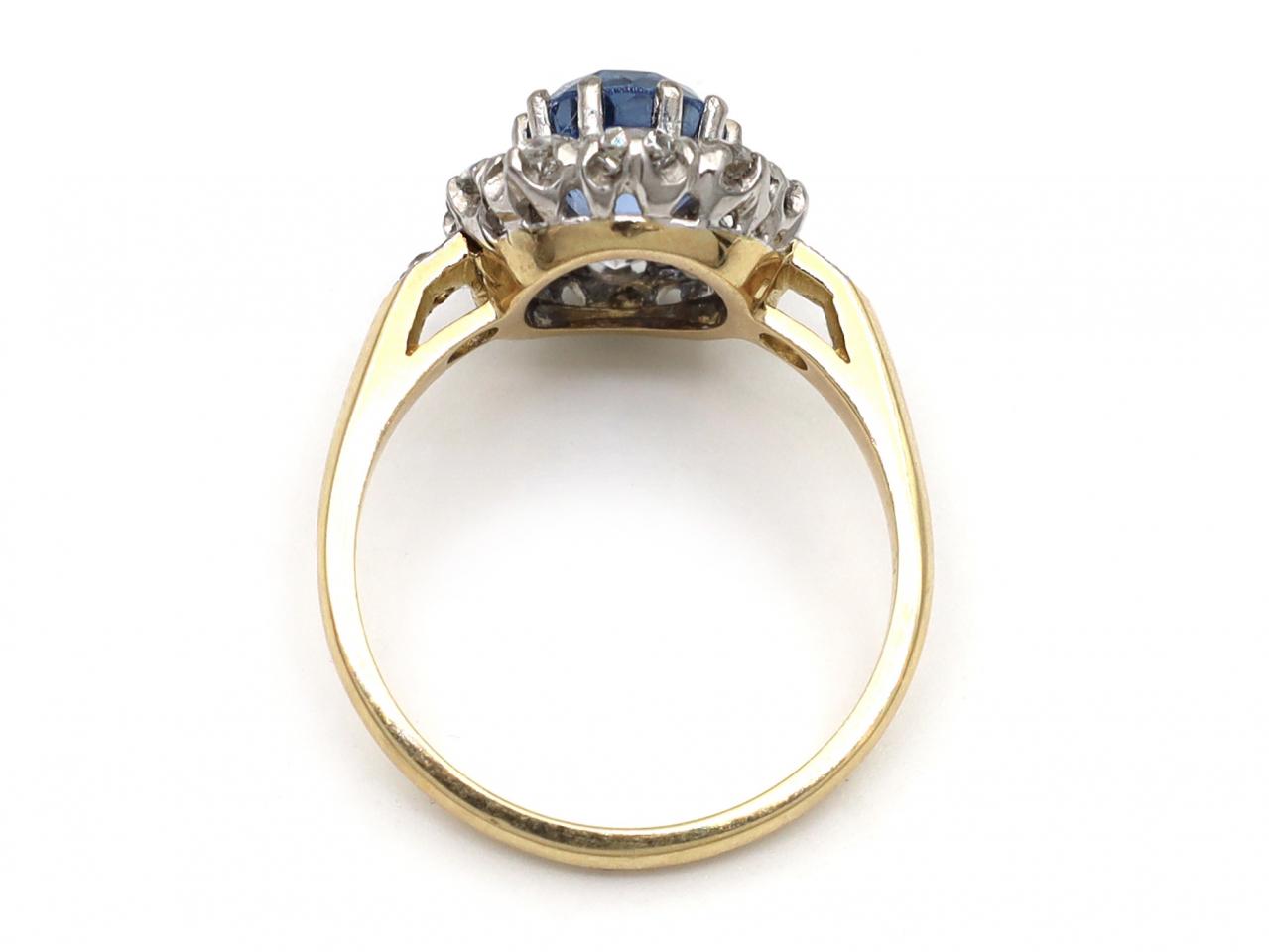 Edwardian Ceylon sapphire and diamond coronet cluster ring in platinum and 18kt yellow gold. Centred with an oval mixed cut Ceylon sapphire in a platinum claw setting, encircled by a row of round Old European cut diamonds in platinum claw settings, to an oval coronet cluster ring with curving claws and pierced open gallery, flanked to either side with diamond set shoulders which smooth to a solid shank. Marked platinum and 18kt gold.