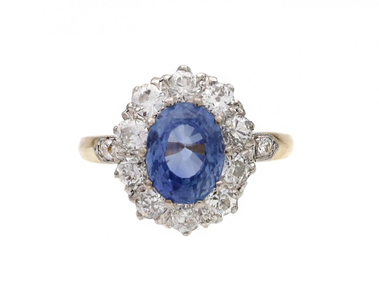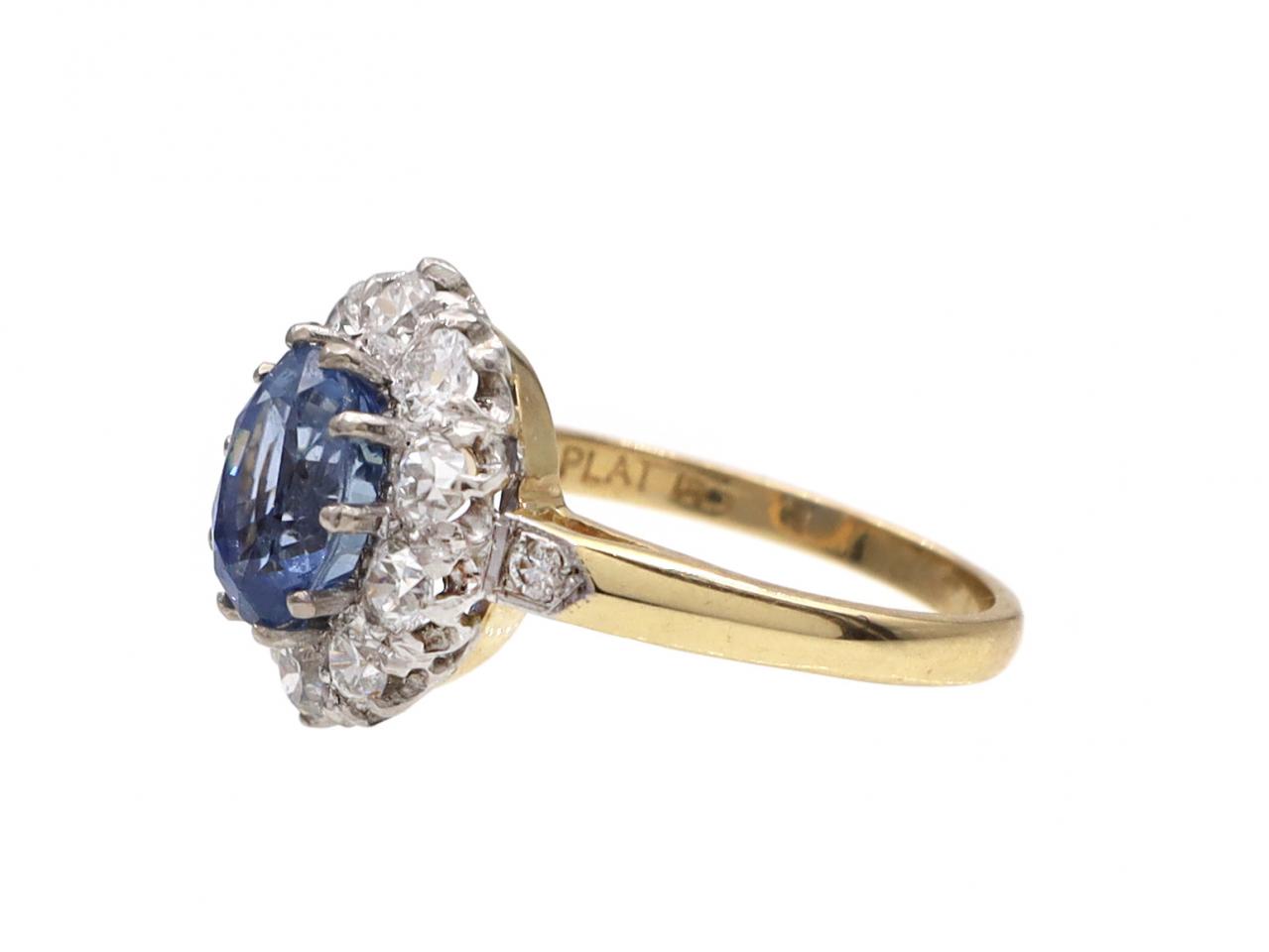 Edwardian Ceylon sapphire and diamond coronet cluster ring