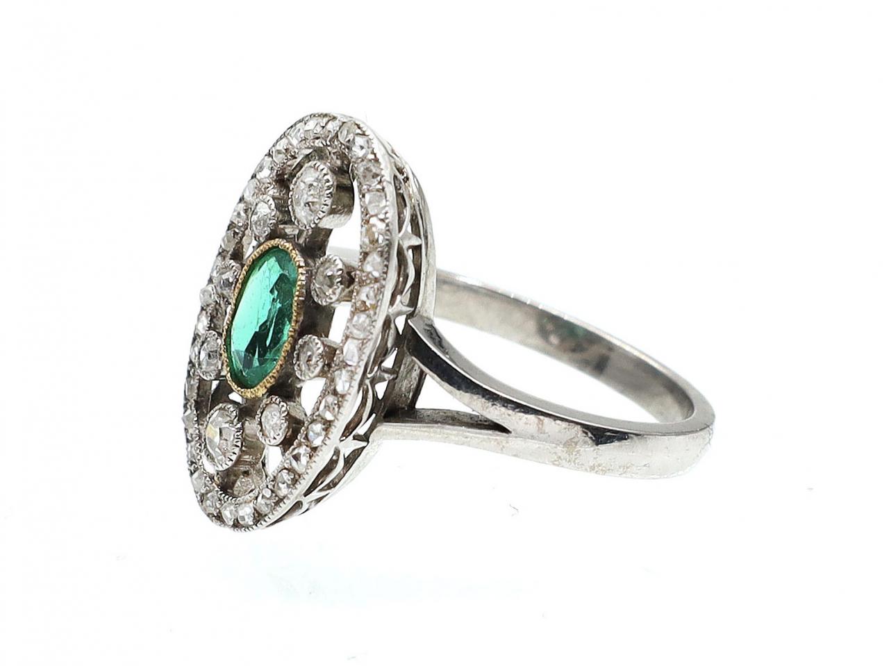 Edwardian emerald and diamond open oval cluster ring in platinum. Centred with an oval mixed cut emerald in a yellow gold millegrain setting, surrounded by eight round cut diamonds in millegrain settings, bordered by a row of rose cut diamonds in grain settings, to an intricate fancy cluster ring with millegrain decoration and scalloped gallery, flanked by split open shoulders which continue to a solid shank.