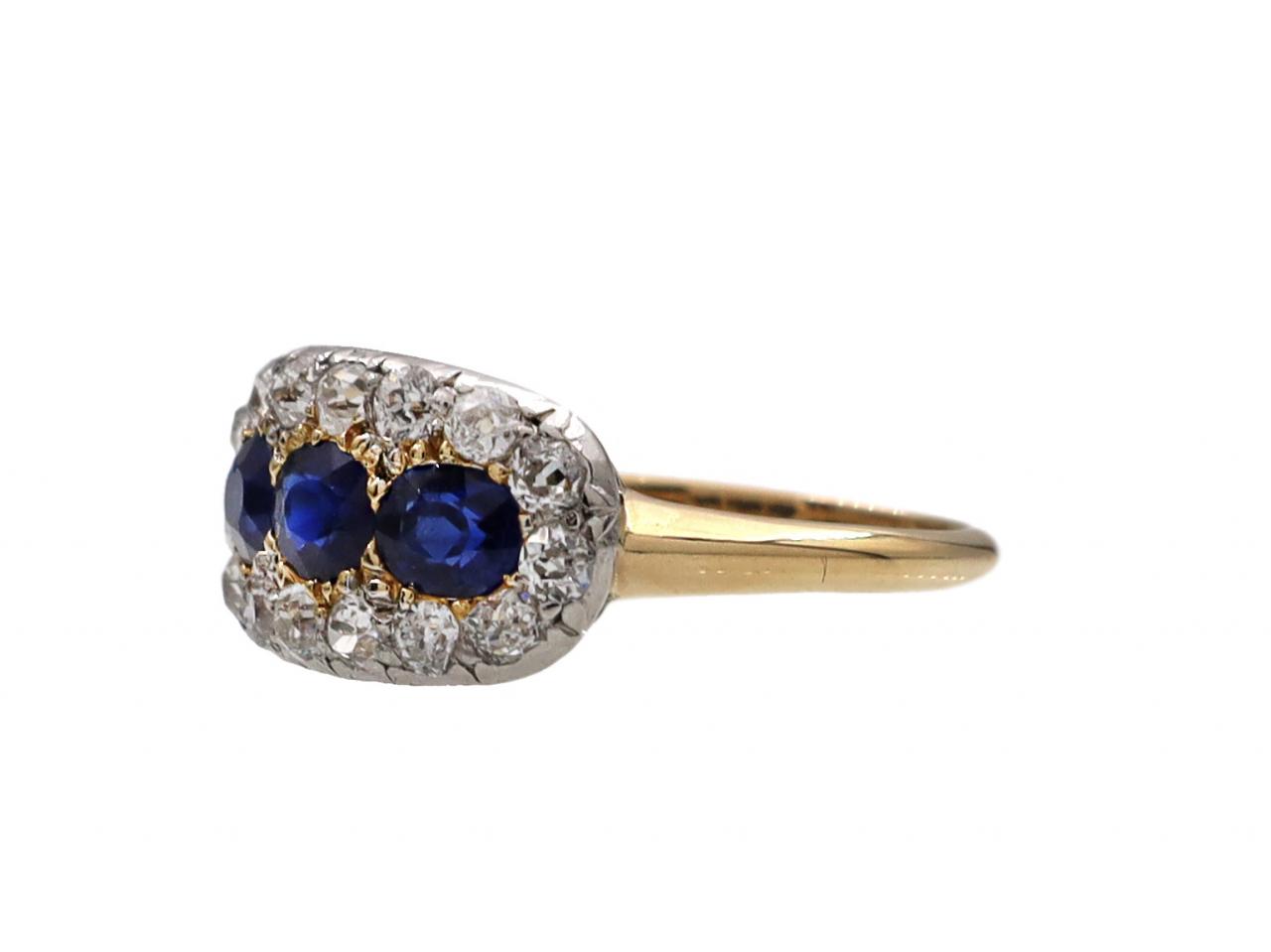 Edwardian sapphire and diamond three stone cluster ring in 18kt yellow gold. Centrally set with three cushion shape mixed cut sapphires in yellow gold settings, surrounded by cushion shape Old Mine cut diamonds in platinum settings, to a horizontal oval cluster with smooth border and fine scalloped gallery, flanked to either side by smooth shoulders which curve to a slim shank.