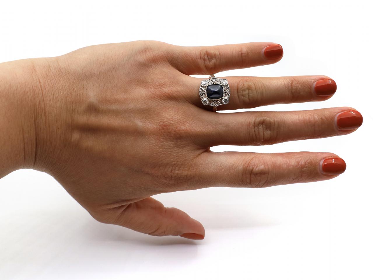 Edwardian sugarloaf sapphire and diamond cluster ring in platinum and 18kt yellow gold. Centrally set with a cushion shape sugarloaf sapphire in a millegrain setting, set top each corner with a round Old European cut diamond in a millegrain setting, further enhanced by round eicht cut diamonds in grain settings, to a rounded cushion cluster with openwork platinum wirework and scalloped gallery, flanked to either side with raised diamond set shoulders which smooth to a solid shank.