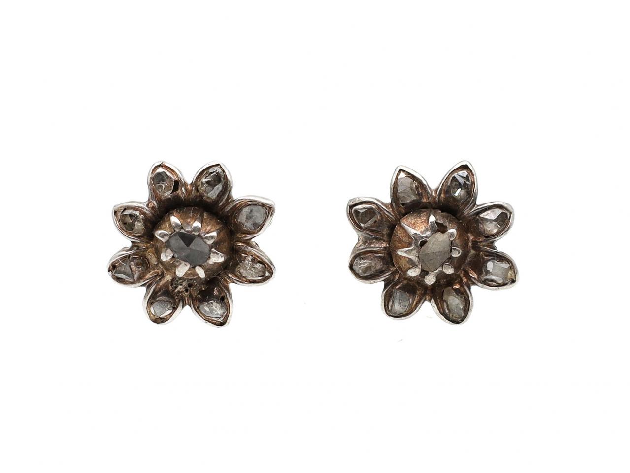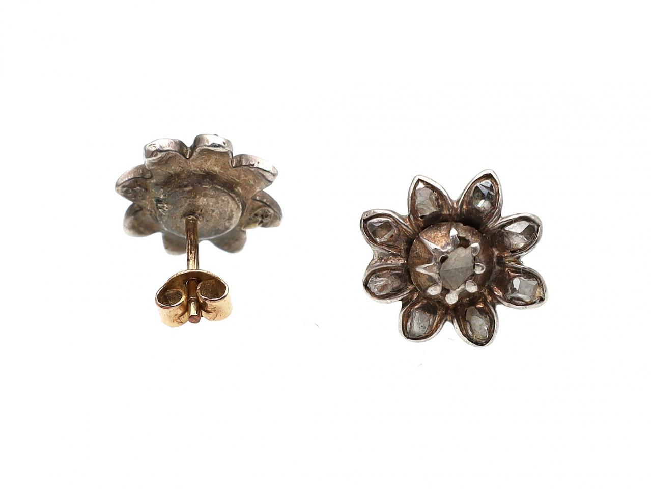 Iberian antique rose cut diamond flower earrings in silver on yellow gold. A matching pair of stud earrings, each consisting of flower motif set with rose cut diamonds in grain settings, fitted to the reverse with a secure yellow gold post and butterfly.