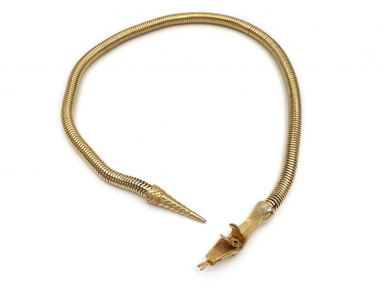 Retro adjustable gold plated serpent necklace. A sinuous rounded necklace fitted to each end with a serpent head terminate and a pointed tail, fitted to the reverse of the head a secure clip mechanism. Created in base metal with a gold plating.