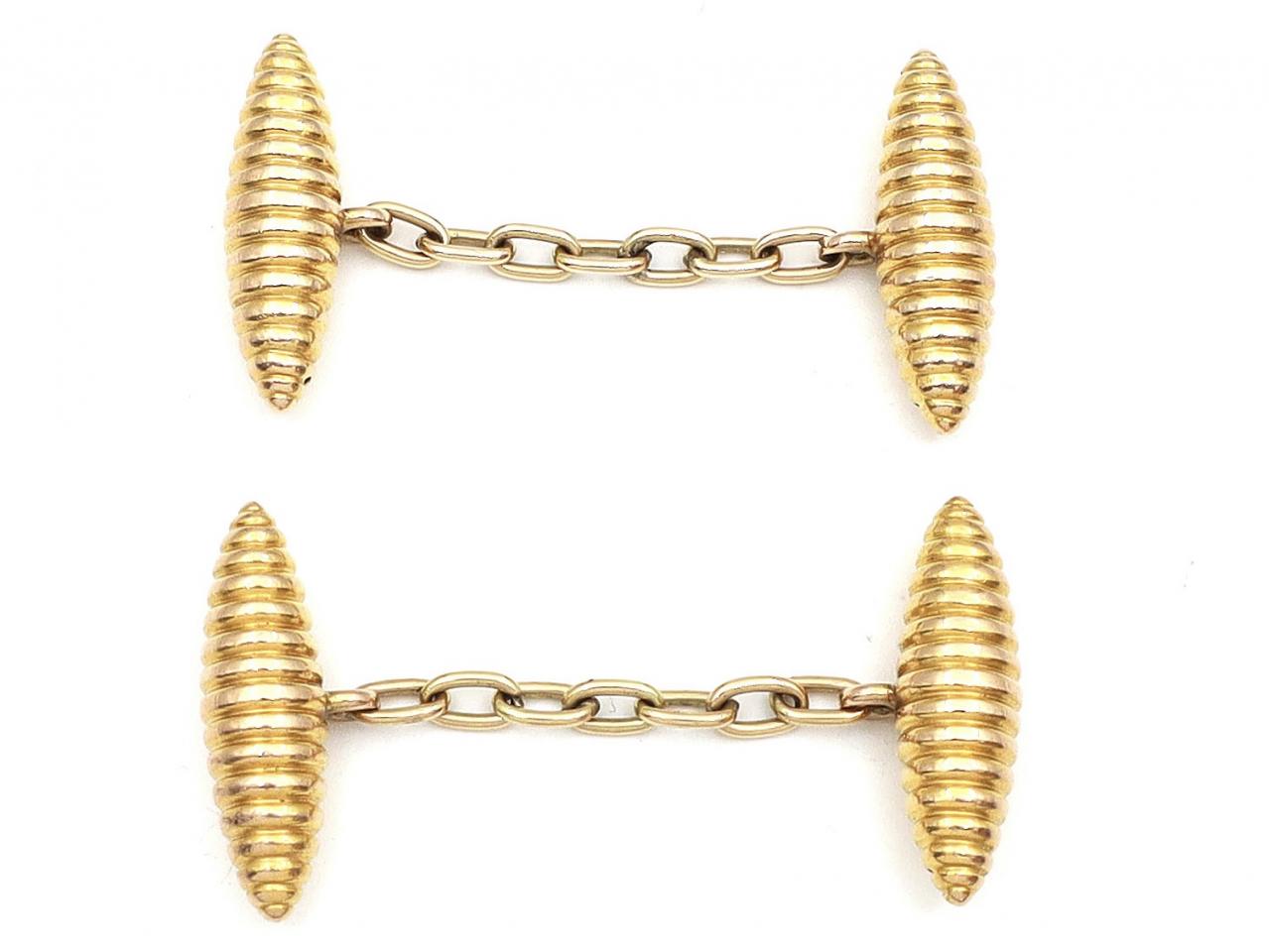 Retro double ribbed torpedo cufflinks in 18kt gold. A matching pair of cufflinks, each consisting of two linear ribbed torpedos connected by belcher chain. Hallmarked 18kt gold.