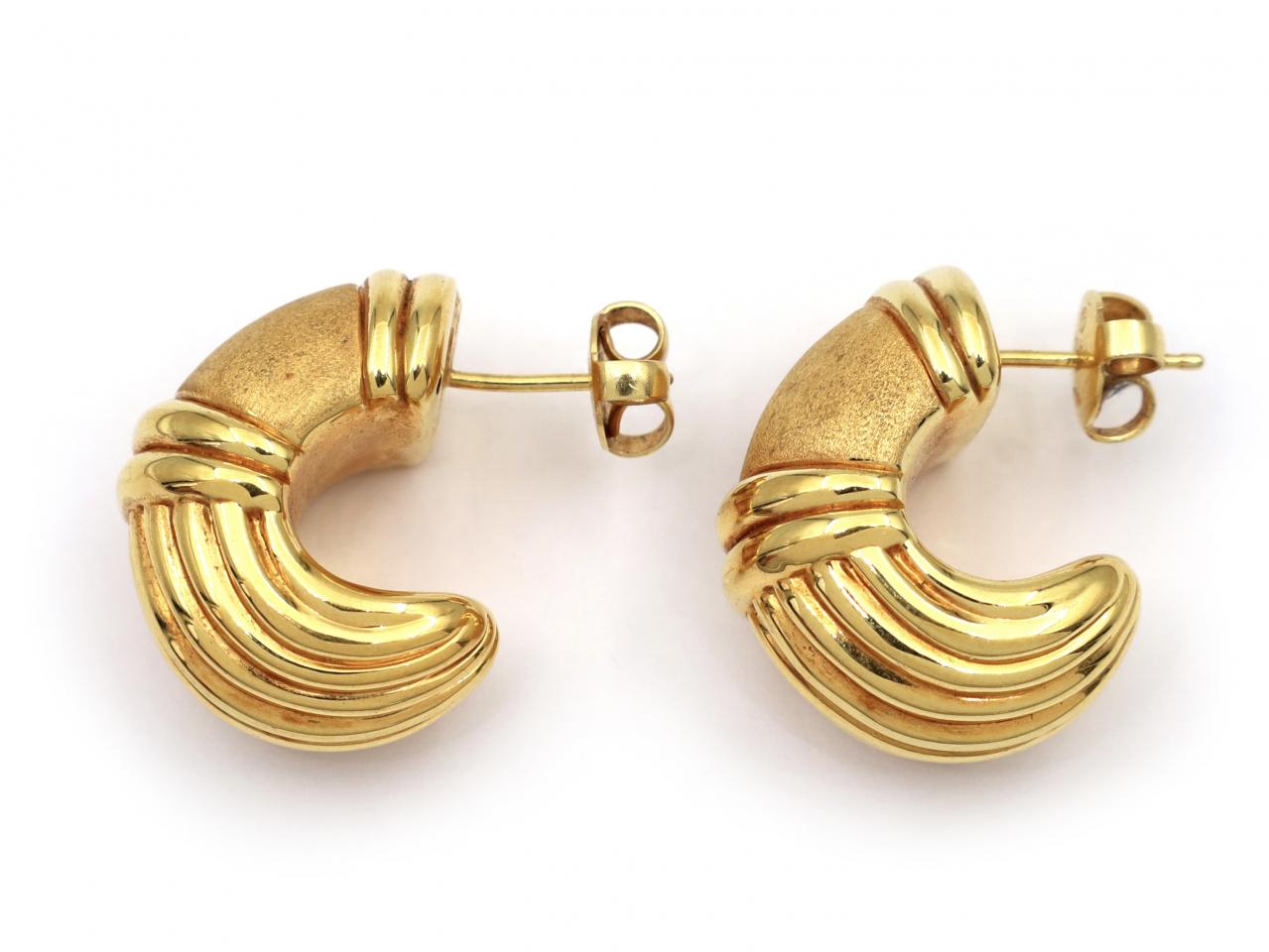 Retro statement half hoop earrings in 18kt yellow gold. A matching pair of earrings, each consisting of a broad hollow half hoop with vertical and horizontal ribbed lines and a central matte panel, fitted with a secure post and butterfly. Marked 18kt gold.