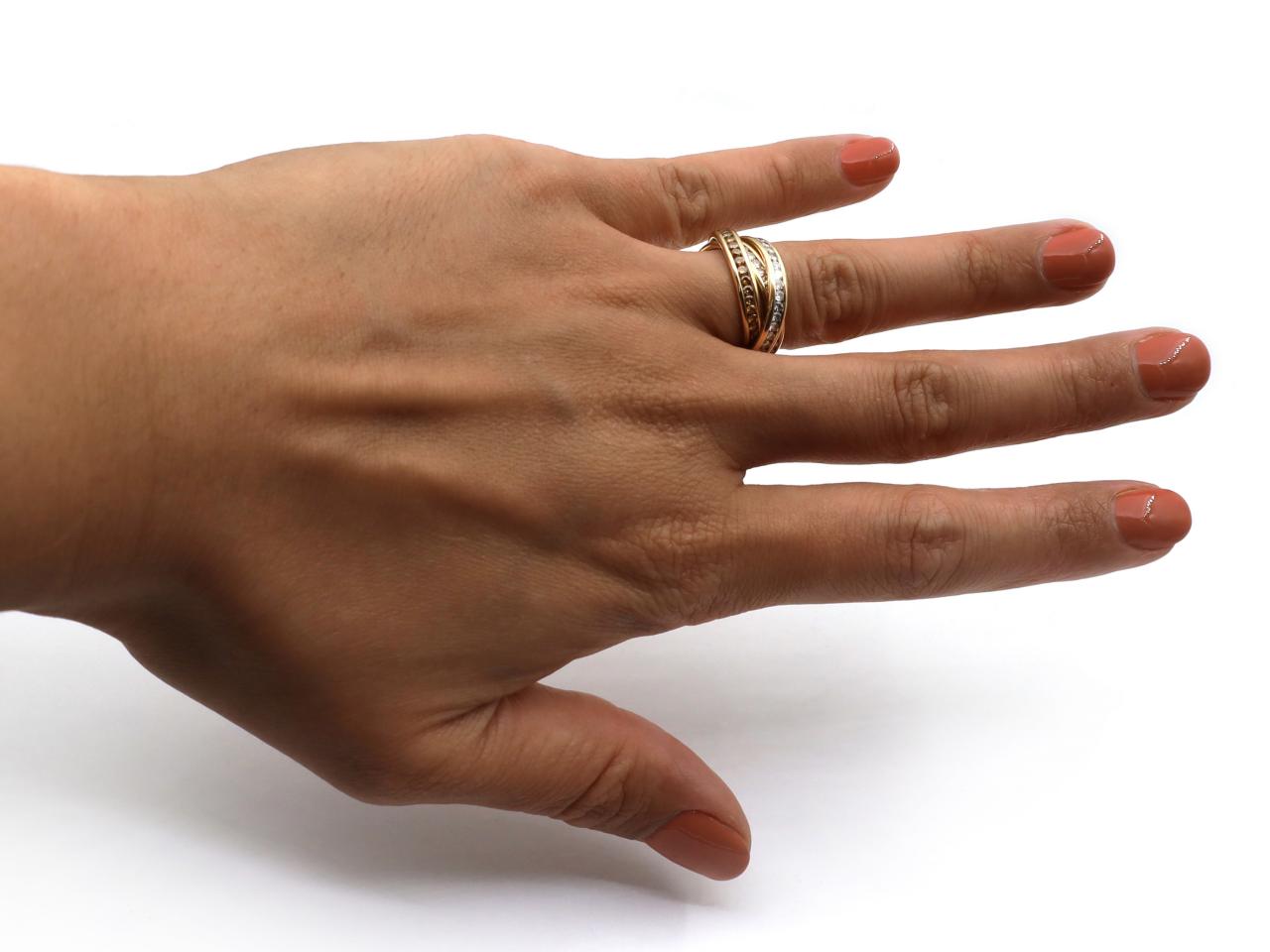Three interlocking diamond and fancy cognac diamond eternity bands in 18kt yellow gold. Three channel set diamonds full eternity bands, two bands set with round brilliant cut diamonds and the third set with round brilliant fancy cognac diamonds. Size: J.