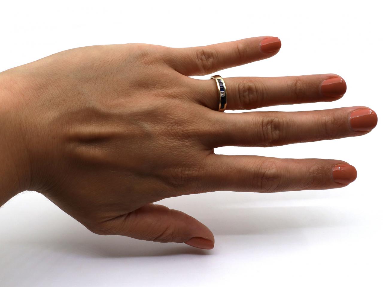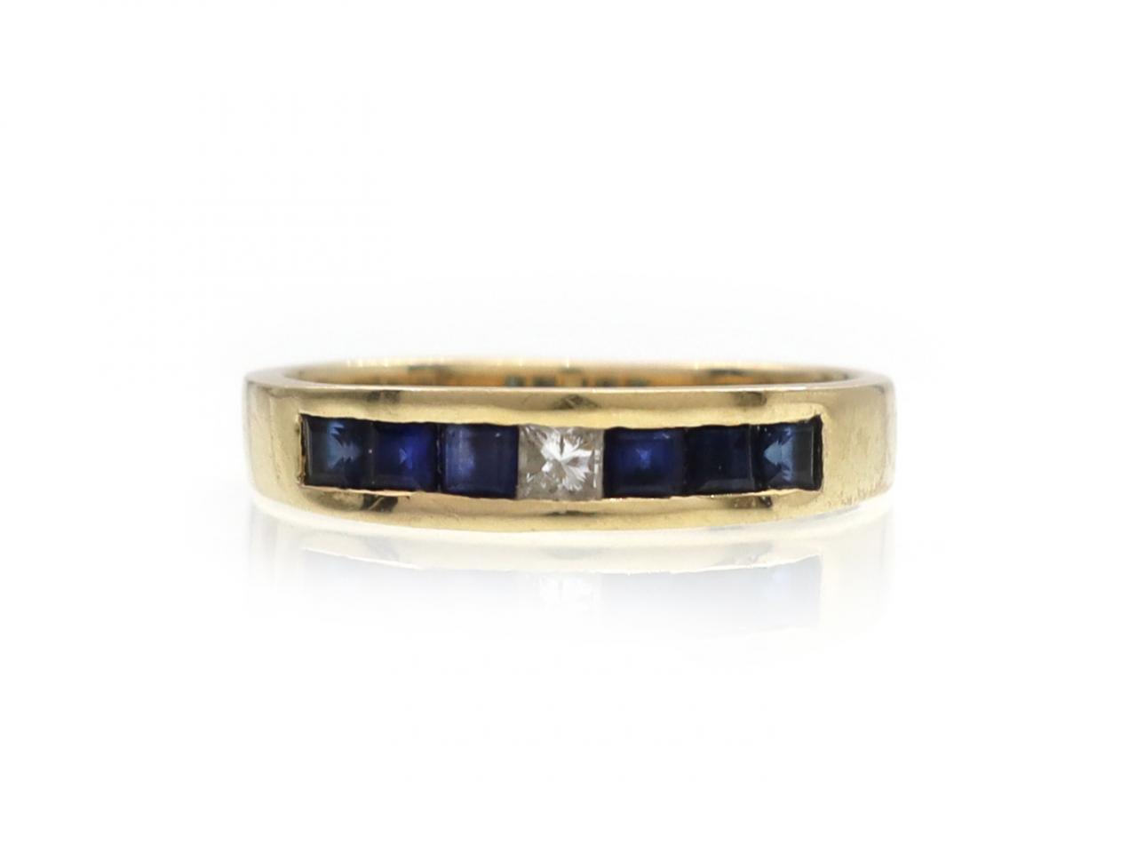 Vintage diamond and sapphire seven stone ring in 18kt yellow gold. Centred with a square princess cut diamond in a channel setting, flanked by six square mixed cut sapphires in channel settings, to a third eternity ring with polished settings flanked to either side with integrated shoulders which curve to a solid shank. Marked 18kt gold.