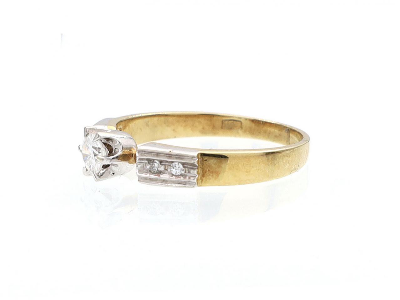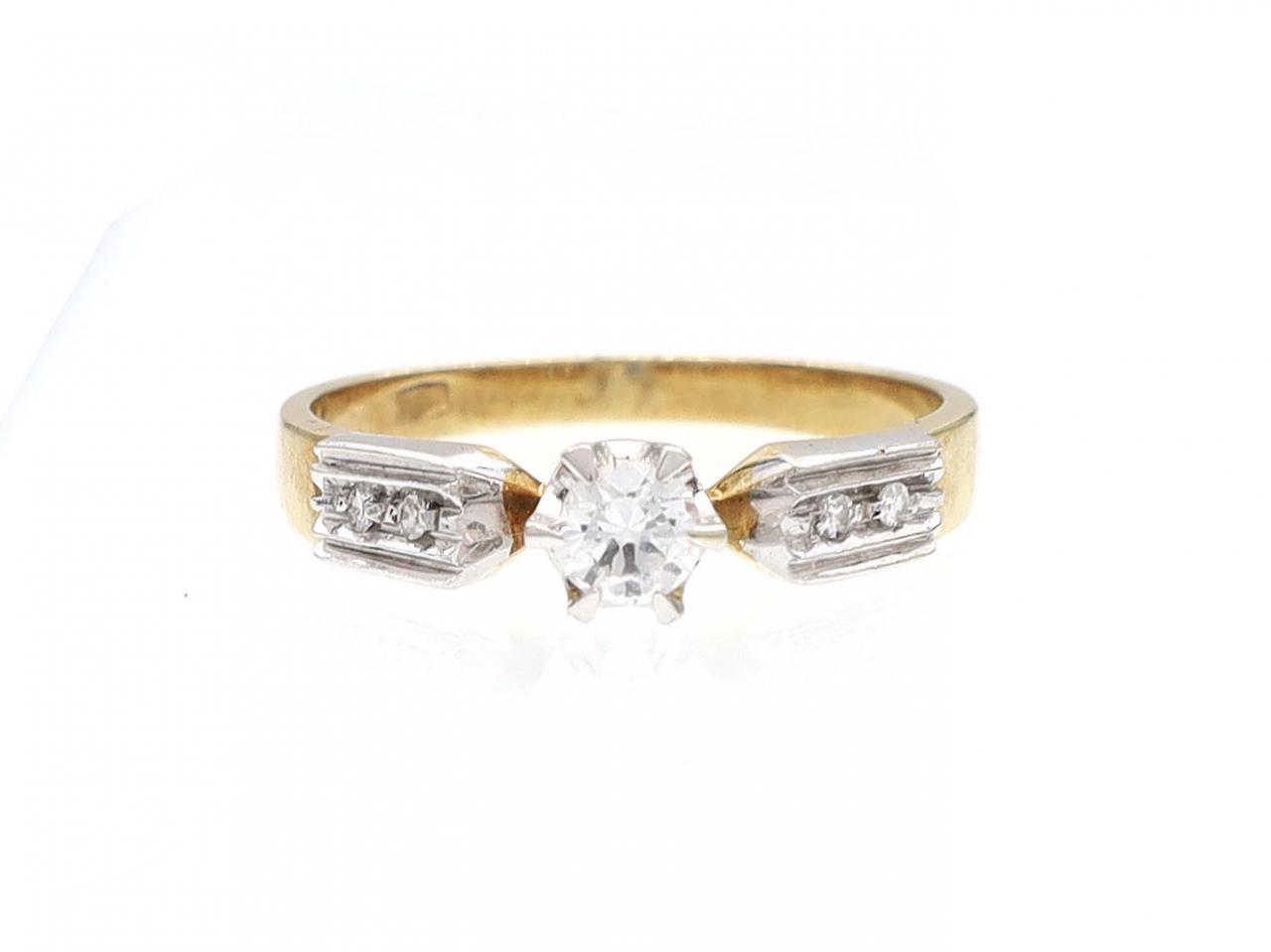 Vintage diamond solitaire engagement ring in 18kt yellow gold. Centred with a round brilliant cut diamond in a raised platinum claw setting, flanked to either side with fine inwardly tapering shoulders which broaden to diamond set plaques with ridged edges, terminating to a solid shank. Marked 18kt gold.