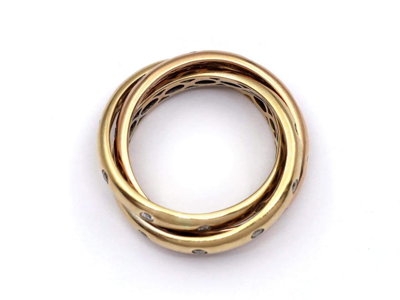 Vintage diamond studded Russian wedding ring in 18kt gold. Three interlocking bands in yellow, white and rose gold, each band set with round brilliant cut diamonds in rubover settings. Size: L.