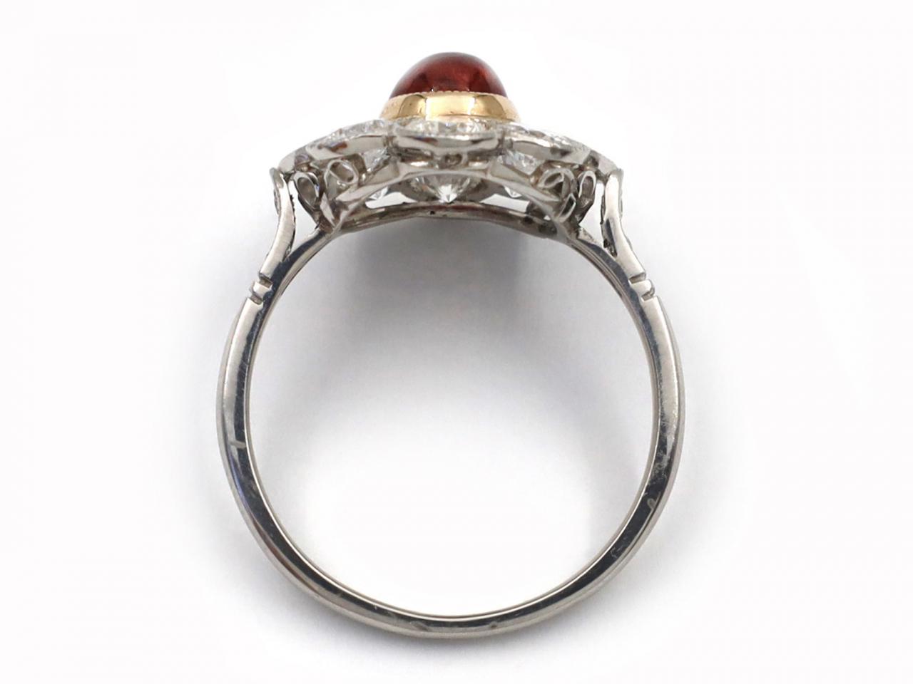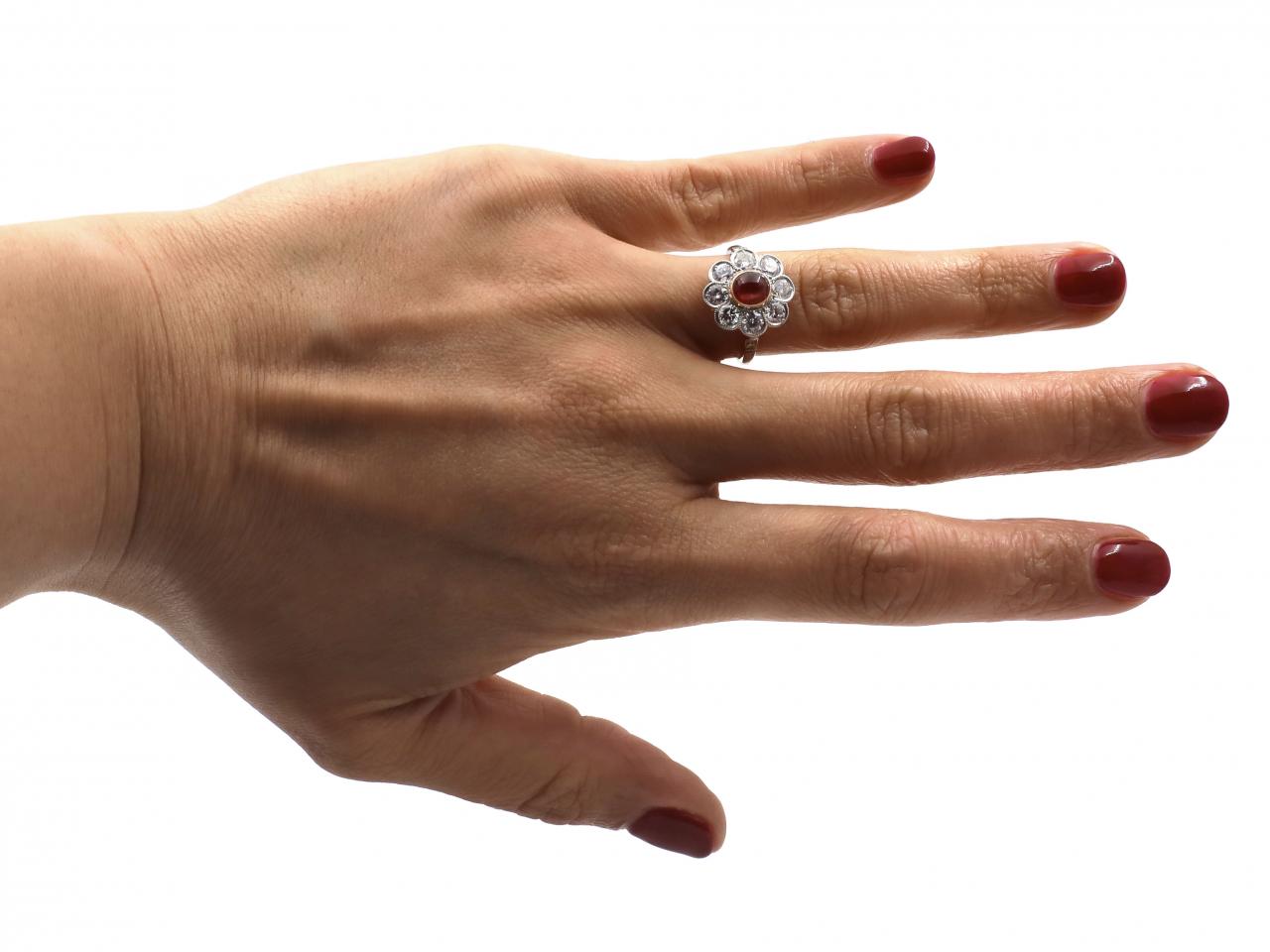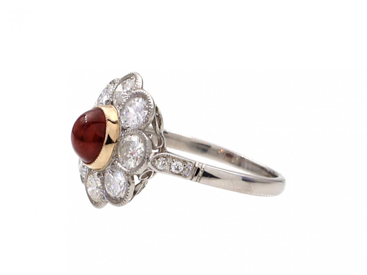 Vintage ruby cabochon and diamond floral cluster ring in 18kt white gold. Set with a round cabochon cut ruby in a yellow gold millegrain setting, encircled by a row of round old cut diamonds in millegrain settings, to a fancy cluster design with pierced open gallery, flanked to either side with raised inwardly tapering shoulders, decorated with grain set diamonds which terminate to a solid shank.
